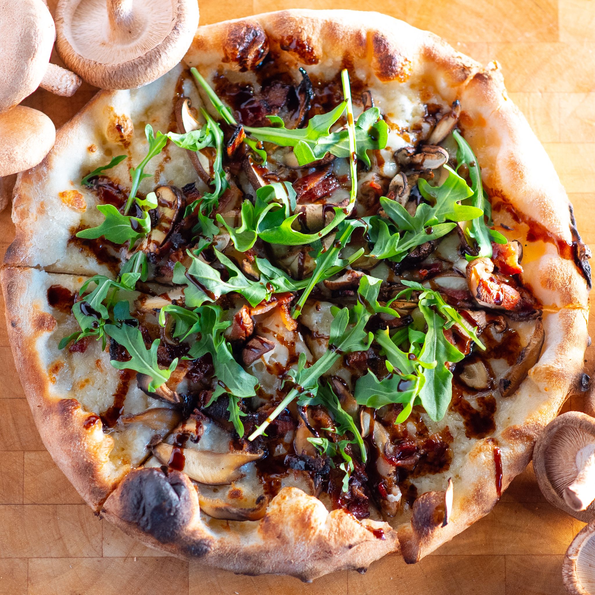 Tartufo Truffle Cheese | Applewood Bacon | Shiitake Mushroom | Tiny Arugula | White Truffle Sauce | Balsamic Glaze